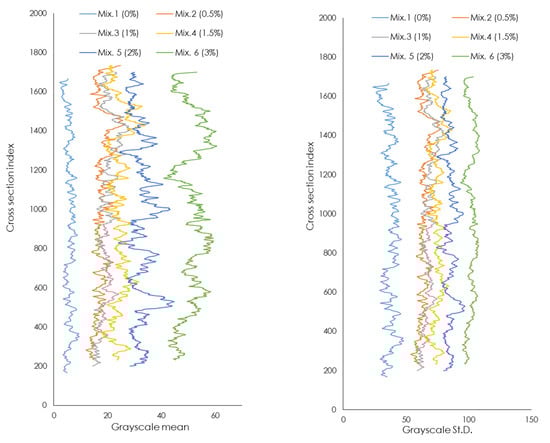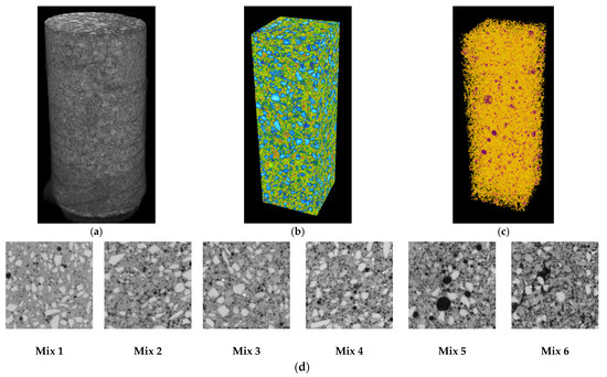 To ensure the correct design of the mixture, it is necessary to limit the segregation phenomena, i.e., the potential separation of the different components of the mixture. In the case of Mix 1, with the addition of cork granules, it is necessary to verify that the final mixture has a homogeneous level of distribution of the aggregates. X-ray micro-computed tomography (micro-CT) scanning was performed on all six mixtures to obtain a quantitative evaluation of aggregate homogeneity in the specimen [43]. Micro-CT is a non-destructive and non-invasive diagnostic technique capable of three-dimensionally visualizing the internal structure of the analyzed objects.
