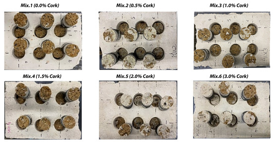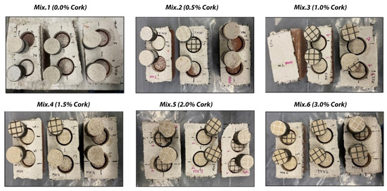 Based on this last work analyzed, the mixtures were prepared adding cork percentages by weight at intervals of 0.5%, 1.0%, 1.5%, 2.0%, and 3.0% to 100 g of Mix 1, as indicated in Table 2. With each addition of cork, the workability of the mixture decreased, until it was decided not to exceed 3.0% of the cork.