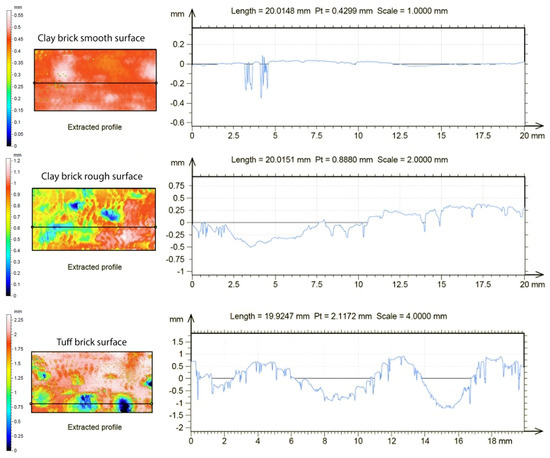 Surface (left) and profile (right) maps of the smooth clay brick, rough clay brick, and tuff brick.