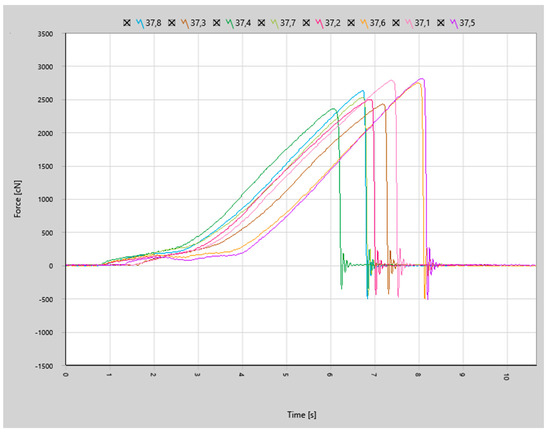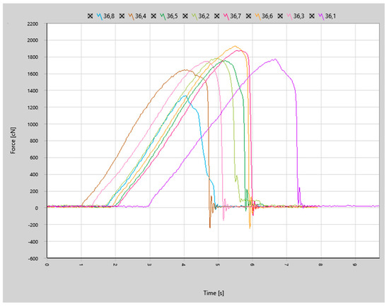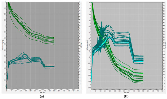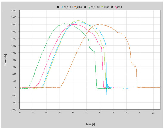 The process curves associated with the first set of parameters can be seen in Figure 2a. The deformation of the wire (green) was in the range of 58–71 µm. For the second set of parameters, deformation was in the range of 110–134 µm, as can be seen in Figure 2b.