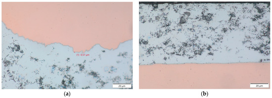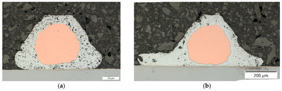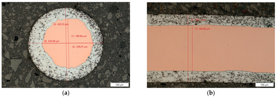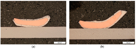 Longitudinal cross-sections depicted in Figure 8a,b revealed that for the more aggressive wire bonding process, the distance between the battery surface area and the copper cores was significantly reduced throughout the whole length of the wire bond.
