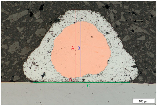 The measurements showed that the wire height as well as the copper core height did not change between the two sets of bonding parameters, as shown in Figure 6a,b. For the more aggressive bonding process that used the second set of parameters, the width of the connection on the battery surface significantly increased, while the distance between the battery surface and the copper core of the wire decreased significantly, as can be seen in Figure 7a,b. This indicated that the aluminum cladding of the wire was pushed out from underneath the copper core to the sides of the wire bond.