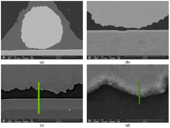 SEM imaging of the transversal cross-section of the bond made with bonding parameter set 2 in magnifications of 400× (a), 1000× (b), 5000× with EDS line (c) and 30,000× with EDS line (d).