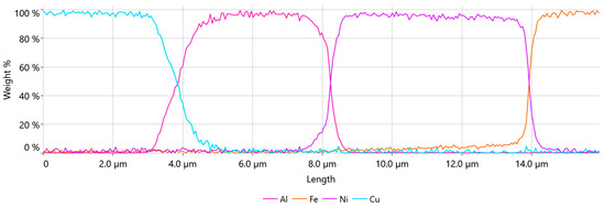 The results of the line EDS shown in Figure 13 prove that for the more aggressive bonding process, the width of the diffusion area could significantly increase by up to 9 µm. Line EDS also revealed that the formation of IMC between Cu and Ni might have occurred in the interface area of the joint.