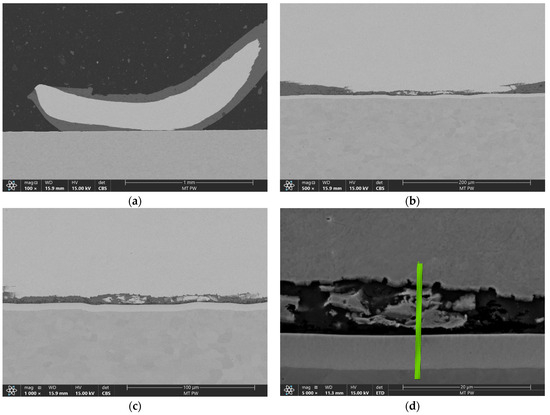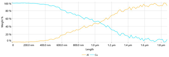 To further investigate the formation of intermetallic compounds in the interface area, a sample with the most visible changes in this region was selected. This was one of the samples bonded with the more aggressive bonding parameters and was the only sample with visible mixing that occurred between the aluminum and the copper. SEM images of this sample are presented in Figure 12a–c, while Figure 12d shows the line selected for the line EDS analysis.