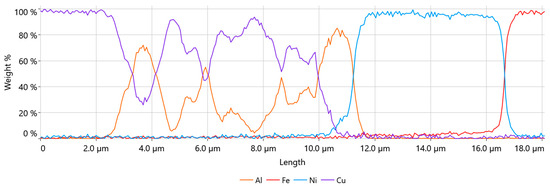 Line EDS was performed to examine the diffusion zone of the materials along the green line shown in Figure 9c. The result is shown in chart form of the weight % distribution of elements in Figure 10.
