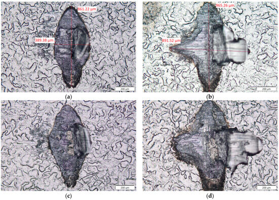 The failure mode of the bonds seen in Figure 17 made with parameter set 1 (Figure 17a,c) and parameter set 2 (Figure 17b,d) shifted from shearing on the tool level observed for H11 Al wire in the previous study to a mix of shearing on the tool level combined with bond liftoff. This indicates that once the sheer tool moving from right to left contacts the copper core of the wire, a liftoff of aluminum cladding at the battery surface level occurs. This mixed mode of failure might be the reason for the more brittle failure of the joints, as indicated by the shear test curves. In some cases, a steel substrate could be seen in the center of the sheared bond, as seen in Figure 17c,d. This indicated a very good connection between the copper core and the outer shell of the wire that was stronger than the joint formed between the outer shell and the battery surface. It should be noted that standards regarding the testing of wire-bonded joints are not intended to be used to judge the failure mode of wires made out of non-homogeneous materials such as two-component wires, so we did not consider the bond liftoff during the shearing of the copper core as a negative test result.