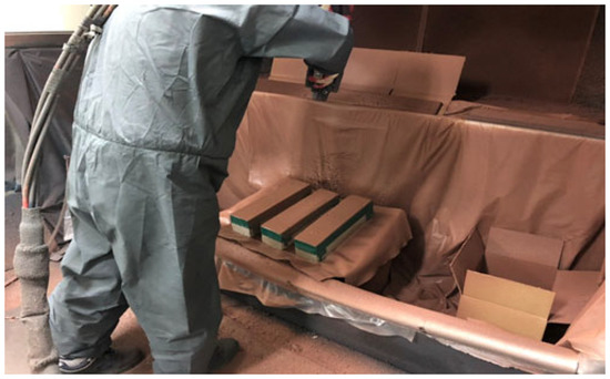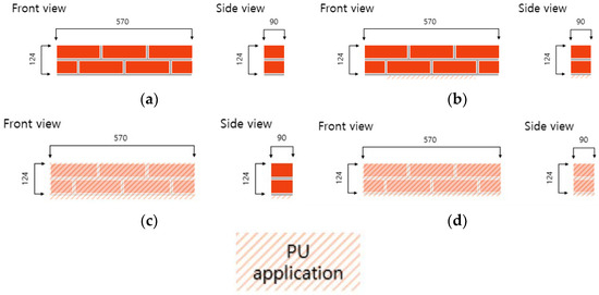 Red bricks with dimensions of 57 × 90 × 190 mm and a 10 mm mortar thickness were used for manufacturing the masonry member for the flexural strength test. To observe the reinforcing effect of STPU under extreme conditions, we simulated the critical situation where a masonry beam is subjected to a bending load. Figure 1 illustrates the effect of STPU reinforcement in various forms when applied to the masonry beam with low flexural strength in three-point bending tests. The masonry member was manufactured with a size of 124 × 90 × 570 mm and a span of 390 mm, and the 0.5B stacking method was used, as shown in Figure 1. Since the 0.5B stacking method is a method of stacking bricks in one row, the bricks used for the first floor were cut in half and used. The compressive strengths of the red brick and mortar used were 5.5 MPa and 22 MPa, respectively. STPU was applied with a thickness of 2 to 3 mm and at a distance of 60 cm from the specimen, as shown in Figure 2. STPU was continuously sprayed back and forth 8 to 10 times, and the application was carried out as uniformly as possible. Polyurea can be used under extreme conditions. However, in this study, the polyurea was applied by spraying, and both the spraying and testing were conducted at a temperature of 24 °C and a relative humidity of 65% [29].