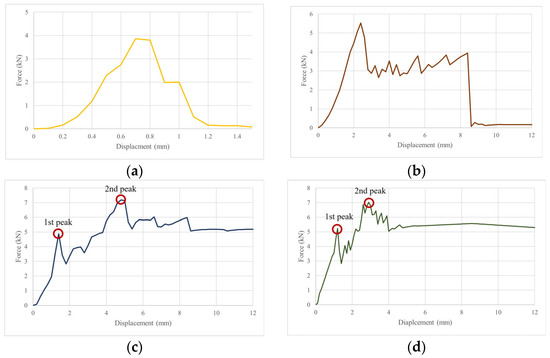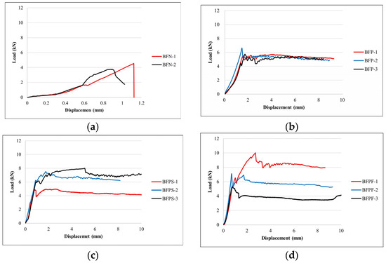 Load–displacement graph of the flexural strength test. (a) BFN. (b) BFP. (c) BFPS. (d) BFPF.