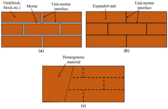 Finite element modeling methods of masonry wall. (a) Detailed micro-model. (b) Simplified micro-model. (c) Macro-model [31].