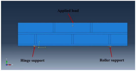 The flexural strength tests were performed under three-point bending, and the boundary conditions described in Figure 11 were applied. As shown in Figure 11, the loading was controlled by displacement. To apply the load, a 13 mm displacement was applied under the boundary condition. Explicit analysis was utilized because the results were not linear, and our interest was in observing severe damage (element separation) beyond plastic deformation. The general contact (explicit) in ABAQUS was used to create the interface between the mortar and the brick and an unstructured mesh was used to model the nonlinear behavior of the mortar. The mesh size of the brick and mortar was 50 mm, with eight-node element types of C3D8R applied. The 30 mm mesh size and the C3D8RH element type were applied for STPU.