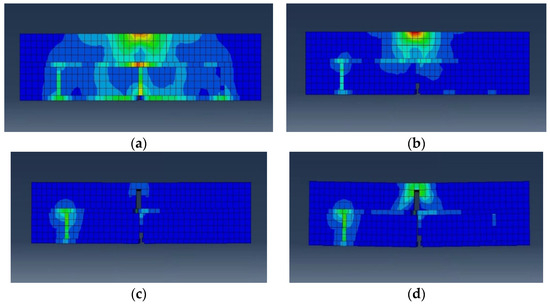 Figure 12 shows a summary of the results of the numerical analysis of the flexural strength test performed using ABAQUS. Figure 13 and Figure 14 show the element failure and damaged shapes after the load was applied. Figure 12 shows that the maximum load occurred in the following order: BFN followed by BFP, BFPS, and BFPF. The maximum load difference between BFPS and BFPF was small, measuring only 0.16 kN. The reinforcing effect of STPU was proven, with the maximum displacement that could withstand the load being 0.8 mm in BFN and 8.4 mm in BFP. Moreover, the maximum load in BFP was higher than that in BFN. As shown in Figure 12b, the BFP specimen, reinforced with STPU only in the lower part, could withstand a load of up to 8.4 mm after the maximum load. Presumably, the lower part of the masonry wall fails at the maximum load, which can explain this phenomenon. After withstanding a 3–4 kN load under the reinforcing effect of STPU, cracks that started in the lower part of the wall spread to the upper part, which could no longer hold additional loads. As shown in Figure 12c,d, when the front and back of the specimen were reinforced with STPU, the first and second peaks were observed in the force–displacement graph, which is presumably due to failure in the lower part of the masonry wall at the first peak. Moreover, the load was supported by the tensile strength of STPU until cracks gradually progressed to the upper part, leading to failure in the upper part at the second peak. The numerical analysis graph of BFN in Figure 12a is similar to the BFN-2 graph in Figure 5a; the graph in Figure 12b exhibits a similar trend as the BFP-2 graph in Figure 5b; the graphs in Figure 12b,c exhibit similar behaviors as the BFPS-3 and BFPF-1 graphs in Figure 5c,d, where the first and second peaks were observed, respectively.