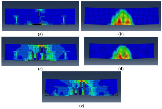 Figure 13a shows that the first element failure occurred in the central lower part of the mortar in the BFN specimen. The element failures in Figure 13b–d reveal that the failures progressed toward the central upper part as displacement increased. Figure 13 shows that the pattern of cracks observed via numerical analysis is similar to that in Figure 6a, which presents the actual experimental results. Figure 14a shows that the BFP crack pattern, which shows a similar crack pattern to that of BFN but with more elements in the lower part, failed. BFPS and BFPF reinforced with STPU on the front and back exhibited failure patterns that progressed not only in the central part but also to the sides in the internal section of the masonry wall, as shown in Figure 14c,e.