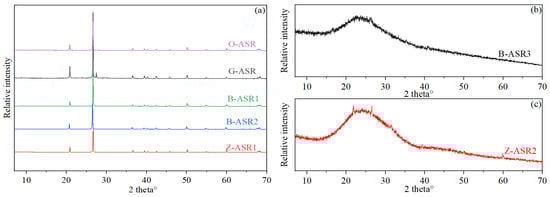 X-ray diffraction test results of various ASR materials: (a) O-ASR, G-ASR, B-ASR1, B-ASR-2, Z-ASR1, (b) B-ASR3, and (c) Z-ASR2.