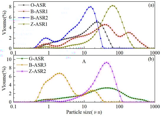 Particle size distribution analysis of various ASR materials: (a) O-ASR, B-ASR1, B-ASR2, Z-ASR1, and (b) G-ASR, B-ASR3, and Z-ASR2.