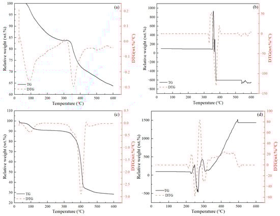 Representative TGA test results of the cement additives: (a) O-FR1; (b) B-FL; (c) O-FR2; (d) B-RT.