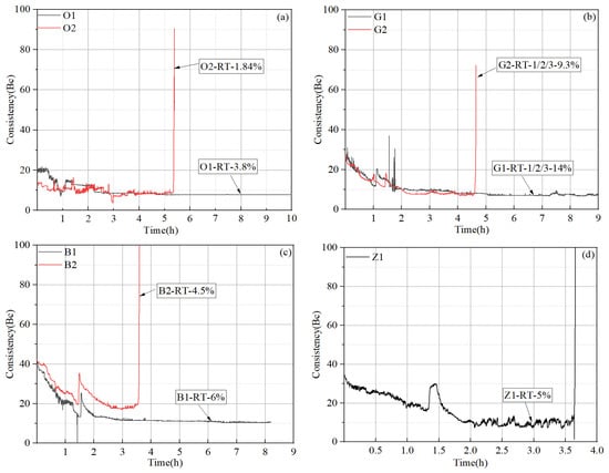 Thickening time test results of the cement slurries from different service providers: (a) slurries O1 and O2; (b) slurries G1 and G2; (c) slurries B1 and B2; (d) slurry Z1.