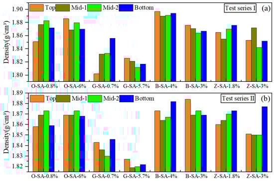 The slurry formulation designs obtained after thickening time optimization (i.e., slurries O2, G2, B2, and Z1 in Table 5) were further employed as the base slurry to evaluate the influence of suspension aid on the sedimentation stability of these different systems. Each system was tested with two different dosages of suspension aid, and the corresponding sedimentation test results are shown in Figure 5. Two replicate samples were made for each dosage of suspension aid (designated as test series I and II, respectively) to check the repeatability of the test results. It can be seen that within the range studied, a vast majority of the samples exhibited excellent sedimentation stability with the maximum density differences from the top to bottom sections less than 0.02 g/cm3, indicating excellent sedimentation stability control of all of the suspension aids employed. The average final density of most systems was approximately 1.87 g/cm3, except for slurry “G” systems, which had a density of approximately 1.82–1.83 g/cm3.