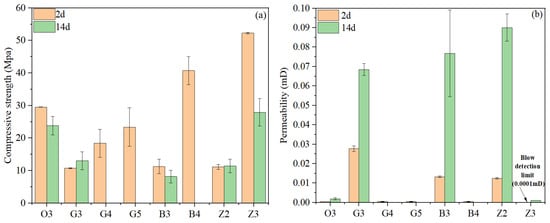 After optimization for sedimentation stability, several slurry designs were obtained for an evaluation of the physical and mechanical properties of hardened cement, as shown in Table 6. All slurries were used to produce 2-day cure samples, while only selected slurries were used to produce 14-day cure samples to study the strength stability over time. The compressive strength and permeability test results of these slurries are shown in Figure 6. It was observed that the 2-day compressive strengths of three slurries containing 40% anti-strength retrogression material G-ASR (slurries G3, B3, Z2) were very low (approximately 10 MPa), suggesting that they would not meet the design requirement. Additionally, while the strength of these three slurries were relatively stable during further curing until 14 days, the permeability of the set cement experienced significant increases, which were all above 0.05 mD after a 14-day cure, also missing the design requirements. When the dosage of G-ASR was increased from 40% to 60%, the 2-day compressive strength of slurry G4 increased significantly to 18 MPa. When G-ASR was replaced with O-ASR with finer particle sizes and higher silica purity, the 2-day compressive strength of slurry G5 further increased to 23 MPa. Similarly, by replacing 40% G-ASR with 60% O-ASR in slurry B3, the compressive strength of slurry B4 increased to 40 MPa. These observations were consistent with previous studies in that adding a higher dosage and/or finer particle size of silica typically leads to a higher compressive strength of the oil well cement, especially in the early curing period [,]. However, as demonstrated in many previous studies [,,], only adding silica to oil well cement systems could not prevent the long-term strength retrogression of oil well cement systems. Indeed, strength reductions and permeability increases could be observed in both slurry O3 and slurry Z3, therefore, additional anti-strength retrogression material would be needed to stabilize their long-term strength.