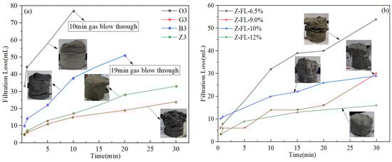 Fluid loss test results of various cement slurries: (a) slurries O3, G3, B3, and Z3; (b) slurry Z systems with different dosages of Z-FL.
