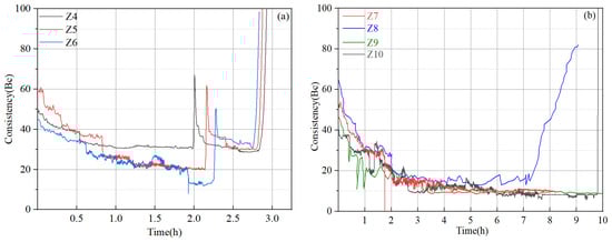 Thickening time test results of slurry Z system: (a) slurries Z4, Z5, and Z6; (b) slurries Z7, Z8, Z9, and Z10.