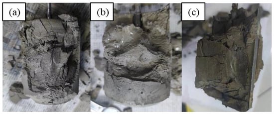 Apparently, in order to meet the fluid loss design requirement, high dosages of fluid loss additive are needed, according to the test results in Section 4.5. Thickening time tests were conducted based on several new slurry designs (Table 7), and representative test results are given in Figure 8. The addition of a high dosage of a fluid loss additive significantly increased the viscosity of the cement slurries, with the initial consistency ranging between 40 Bc and 60 Bc, suggesting that these slurries may be difficult to pump in field applications. In several of these designs (slurries Z4, Z5, Z6), abnormal gelation phenomena were observed: the consistency evolution curves experienced dramatic and sudden jumps followed by sudden drops with equal or smaller magnitudes before the slurries finally thickened. When these tests were stopped and the samples were taken out, it was observed that the cement was set but did not harden (Figure 9), suggesting that abnormal gelation led to false setting. By slightly adjusting the dosages of the retarder, fluid loss additive, and friction reducer, the abnormal gelation issue could be effectively mitigated. However, the test results seemed to be highly sensitive to small changes in additive dosage, and it was almost impossible to determine what combinations of additive were the optimum design. This will also cause problems in field applications, where it is difficult to precisely control the additive dosages.