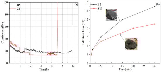 Test results of the finally optimized cement slurries: (a) thickening time; (b) fluid loss.