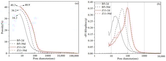 The macroscopic physical and mechanical properties of oil well systems are closely related to their microstructure. It has been demonstrated in several previous studies that microstructure coarsening is the cause of the high-temperature strength retrogression of oil well cement systems [,,]. In general, the compressive strength decline will only occur when the microstructure coarsening has reached a certain threshold. It takes a much longer time to observe strength declines, while microstructure changes can be observed during the early curing period. Therefore, microstructure analysis can serve as a more effective early-warning indicator regarding whether a system is stable or not at high curing temperatures. Figure 12 shows the MIP test results of the two final cement slurry systems cured for different periods. It can be seen that slurry B5 had a finer initial microstructure with a porosity of 34.2% and a median pore size of 20 nm after being cured for 2 d. However, the microstructure experienced some degree of coarsening during further curing from 2 d to 30 d, with the porosity and median pore size increasing to 38.2% and 45 nm, respectively. In contrast, slurry Z11 had a coarser initial microstructure, with a porosity of 40.3% and a median pore size of 100 nm after being cured for 2 d, which almost did not change during further curing from 2 d to 30 d. The microstructure test results presented good agreement with the permeability test results shown in Figure 11.