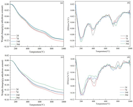 TGA test results of set cement after different curing times: (a) thermogravimetry and (b) derivative thermogravimetry curves of slurry B5; (c) thermogravimetry and (d) derivative thermogravimetry curves of slurry Z11.