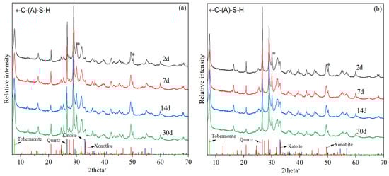 The X-ray diffraction (XRD) test results of the slurries at different curing times are presented in Figure 14. The unreacted quartz peaks were obvious in both slurries at all curing times. The main hydration products of slurries B5 and Z11 both included semi-crystalline C-(A)-S-H (hump peak in the range of 28.5° to 33.5°), tobermorite, and an alumina-bearing phase such as katoite and grossular. Compared to traditional silica-enriched well cement systems with no aluminum-bearing ASR materials [,,], the tobermorite peak at 7.9° in these two slurries was significantly enhanced, which is critical for long-term strength stabilization [,]. The presence of a xonotlite phase in the slurry B5 samples were confirmed by the unique peaks at 12.7°, which were almost absent in slurry Z11 samples. The katoite and grossular peaks at 32.9° and 56.6° in slurry Z11 were more significant, possibly due to the higher dosage of Z-ASR2 as well as its higher alumina content compared to B-ASR3 (See Table 2). Semi-crystalline C-(A)-S-H is known to be a key phase contributing to the early strength of the cement, while the conversion of C-S-H to xonotlite is known to cause strength retrogression during long-term curing at ultra-high temperatures [,]. However, although the early formation of a significant xonotlite phase typically leads to relatively low early strength of the high-temperature-cured cement, it can significantly enhance the long-term strength stability due to stronger phase stability []. During the curing period from 2 d to 30 d, the XRD profiles of slurries B5 and Z11 exhibited no significant change, indicating that the crystallization of semi-crystalline C-(A)-S-H into xonotlite was possibly inhibited by the combined addition of multiple ASR materials.