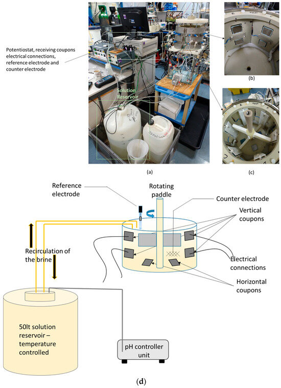 Test rig used for the scaling tests: (a) image showing a general view of the rig, with solution reservoirs, small-scale (flow) vessel, and elements required for the electrochemical measurements, such as potentiostats and reference electrodes; (b) inside the small-scale vessel, showing the location of the coupons and counter electrodes; (c) inside the small-scale vessel, showing the rotating paddle; and (d) simplified schematic diagram of main components in the system.
