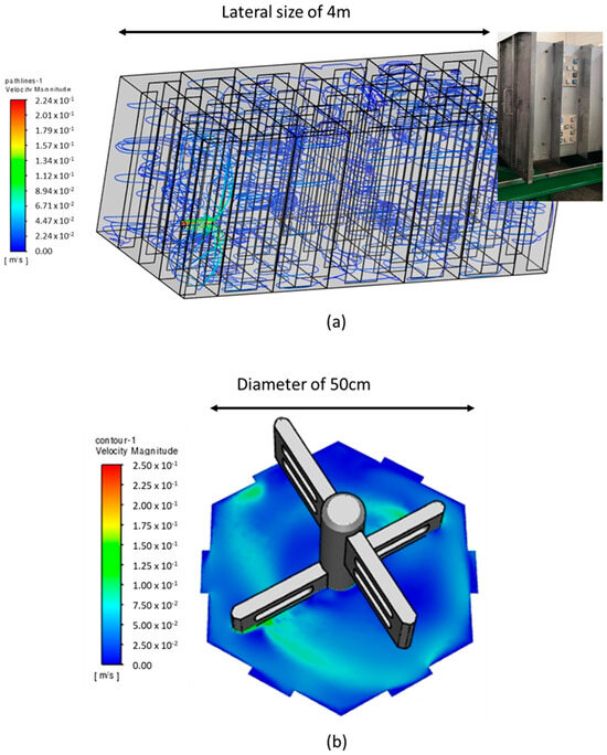 Images generated from the software used for CFD calculations: (a) Pathline plot of velocity magnitude through the full three-dimensional domain of the scaling reactor (along with a picture of the coupons installed in the scaling reactor for the field testing) and (b) Contour plot of velocity magnitude (m/s) in the small-scale vessel.