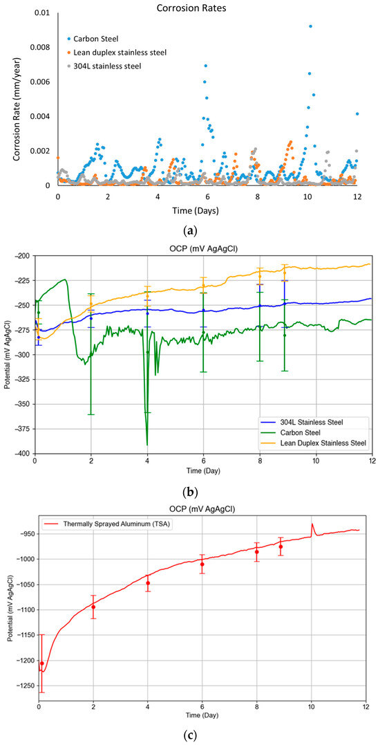 Figure 3a shows representative examples of the corrosion rates calculated for coupons of carbon steel and stainless steel from the LPR measurements. As observed from the curves, the corrosion rate tends to be higher in the carbon steel, as expected—this tended to be in the range below 0.002 mm/year, with no peak above 0.015 mm/year. The first peak (between days 5 and 6) was attributed to a very small addition of diluted HCl, which was used to keep the pH at 9.7, as an increase in pH was noted by day 5 of testing; the reason for the second peak is unknown. For carbon steel, depending on the application, different corrosion rate acceptability criteria (corrosion allowance) have been established (user defined) [19]; however, the numbers obtained from tests are indicative, in general, of low corrosion rate. Regarding the OCP measurements, Figure 3b, it can be seen that the initial OCP value was similar for all the materials at around −260 mV vs. Ag/AgCl electrode at the beginning of the tests, and in the case of the carbon steel coupons, this did not show a particular trend throughout the duration of the tests. In the case of the austenitic stainless steel and the lean duplex stainless steel samples, this shifted to a slightly more positive potential by the end of the 12-day test—this variation reflects a change in the cathodic and/or anodic reactions occurring on the surface of the coupons, i.e., formation of scale on the surface of the samples. In the case of the TSA coupons, Figure 3c, the OCP measurements showed an initial drop in potential (more negative) in the first few hours, followed by an increase during the subsequent 12 days. In the case of TSA, it should be noted that due to the porous structure of the coating, if electrolyte penetrates through the coating, the OCP could be the mixed potential of the aluminium coating and the carbon steel substrate. In particular, investigation of TSA in the literature has revealed that the initial drop in potential could be attributed to dissolution of the air-formed film, while the subsequent increase could be attributed to the formation of protective corrosion products or calcareous deposits [20].