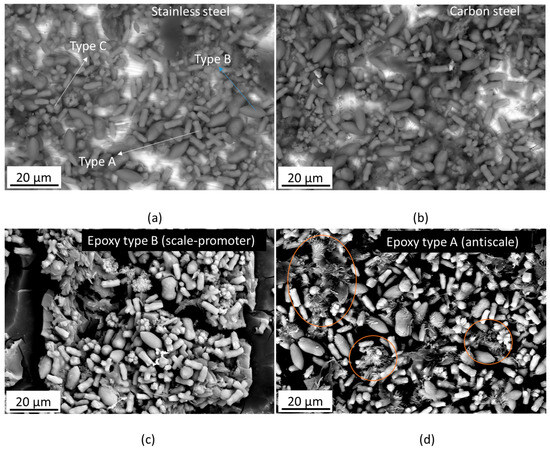 SEM images of the scales taken at a magnification that allowed identification of the individual morphologies of the components of the scale: (a) scales on the 304L stainless steel sample, (b) scales on the steel sample, (c) scales on the epoxy type B, and (d) scales on the epoxy type A.
