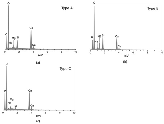 Figure 5 shows SEM images of the scales on two different coupons: carbon steel (Figure 5a) and 304L stainless steel (Figure 5b). The scales formed on both surfaces looked very similar and were composed of features with very specific morphologies, which could be described as a cylindrical curvy shape (type A in Figure 5a), a prolate spheroid “rugby ball” shape (type B in Figure 5a), and a multi-prong shape (type C in Figure 5a). The chemical identification of these from EDX mapping showed that the main elements in the scales were calcium and oxygen (it should be noted that carbon was not included in the maps due to the influence of contaminant elements enriched with this element that could appear in the map). Regarding the presence of silicon in the different types of scales on the surface, it would appear that this element can draw better the silhouette of the type B shape, suggesting Si is associated with type B scale; this is the same case for magnesium. EDX maps exemplifying the behaviour described above can be seen in Figure 6.