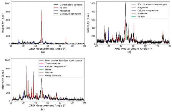 Glancing angle XRD spectra from the surface of the horizontal samples, where the XRD measurement angle corresponded to 2theta. The black spectrum was the obtained experimental data, with library database peaks shown in colour. (a) from carbon steel, (b) from 304L stainless steel, and (c) lean duplex stainless steel.