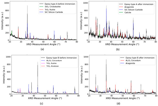 Glancing angle XRD spectra from the surface of epoxy-coated samples, where the XRD measurement angle corresponded to 2theta. The black spectrum was the obtained experimental data, with library database peaks shown in colour. (a) from virgin epoxy type A, (b) from horizontally immersed coupon of Epoxy type A, (c) from virgin epoxy type B and (d) from horizontally immersed coupon of Epoxy type B.