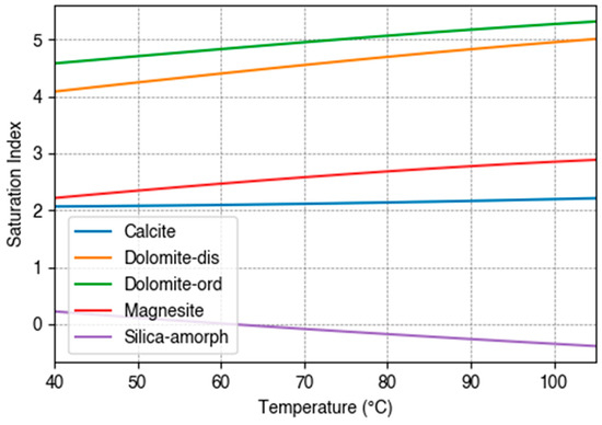 Saturation indices of selected minerals as a function of temperature for the simulated geothermal brine. The saturation index (SI) is defined as SI = log10(Q/K), where Q is the ion activity product of the mineral in solution and K is the equilibrium constant for the mineral’s dissolution reaction. A positive SI value indicates that the mineral is supersaturated and likely to precipitate, while a negative SI value suggests undersaturation.