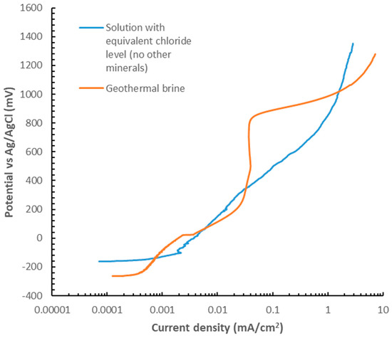 Two possible scenarios could be perceived to explain the reduced corrosion in the materials tested. It could be that the concentrations of ions, particularly chloride, were very low in this solution and no corrosion should be expected, or that the brine solution itself could be acting as a “corrosion inhibitor”. It should be noted that these two hypotheses reflect a very simplified scenario of the complex pitting corrosion mechanism in stainless steel, where the different testing variables could affect the pitting behaviour, i.e., the shape of the pits, the potential for stable pit growth vs. re-passivation, the frequency of pitting, the pit growth rate, among others [25]. The main objective of this exercise was to have a general view of the role of chlorides in promoting corrosion vs. the other elements in the brine. In order to prove this second hypothesis, tests were conducted under the same conditions using the simulated brine, as detailed in Section 2.1.3, and in a solution with an equivalent level of chlorides but without other elements. For these tests, potentiodynamic tests of crevice samples were performed for the 304L stainless steel. The results are shown in Figure 12. The tests were performed on samples with crevice formers. From these curves, it can be seen that apart from a bump in the range from ≈ 120 mV vs. SCE to ≈300 mV vs. SCE, the current is typically higher in the solution containing only chlorides, and in fact, in the geothermal brine, the material displays a semi-passive region. These results suggest that minerals in the brine play an inhibitory role in the localised corrosion of the 304L stainless steel.