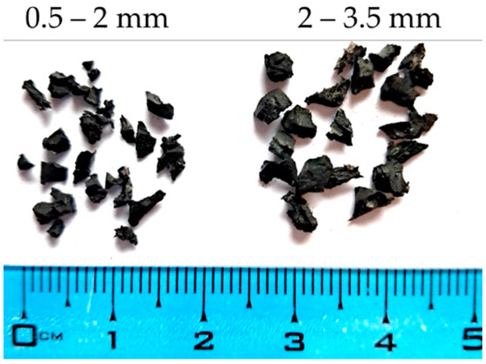 Within this research, waste tire rubber and polyurethane glue densities of 1.2 g/cm3 were used to produce polymer composite samples to be tested as sound and thermal insulation panels. For this purpose, recycled car tires produced by mechanical recycling-cold method were used. This method included removing the tires’ edge reinforcements, followed by the tearing the tires into smaller pieces, suitable for a grinding machine. By grinding, the rubber is crushed into granules, which are separated according to different grain sizes. Within this research, rubber of two grain sizes was used: 0.5–2 mm and 2–3.5 mm. Also, a mixture of two fractions was used, consisting of 35% small fraction (0.5–2 mm) and 65% of coarse fraction (2.5–3 mm). Figure 1 and Figure 2 present the grain size distribution of the rubber used and its appearance, respectively.