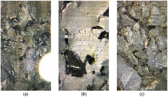 Cross-sections of 10 mm thick panels made from various rubber grain sizes: (a) 0.5–2 mm; (b) 2–3.5 mm; (c) 35% 0.5–2 mm + 65% 2–3.5 mm.