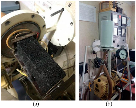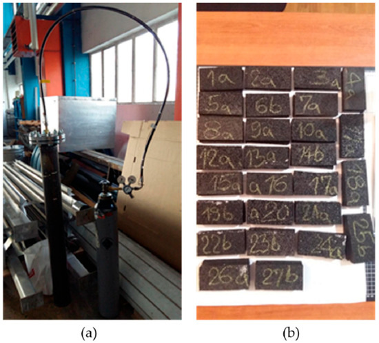 The test method for porosity determination used within this research was based on the connection between Archimedes’ law and the relationship between volume and mass of water. The basic goal is to determine the difference between a dry sample and a saturated sample that can no longer receive any water. Samples were exposed to high pressure in order to fill all pores with water, recording its mass change until constant mass was reached. The pressure used ranged from 16 to 20 bar. Mass recording was carried out every two days, and constant mass was reached after up to 8 days. In Figure 3, a sample cross-section taken by optical microscope is presented, where pores are seen as dark spots and the lighter parts are solid particles, while Figure 4 presents the test setup designed for the purposes of this research. The bright spot in Figure 3a is caused by the reflection from the microscope lens.