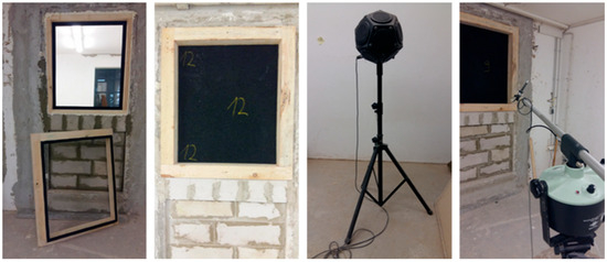 The sample was tested as window glass in a window element in a frame specially designed for this research in dimensions 1 × 0.765 × d (m) where “d” is a thickness of the sample (panel), 10, 15, or 20 mm, as presented in Table 1. The conditions for the frame are airtightness and good sealing of all working holes. Figure 7 shows the airborne sound insulation index test setup. The implementation procedure is according to the standard “EN ISO 717-1:2020: Acoustics—Rating of sound insulation in buildings and of building elements—Part 1: Airborne sound insulation” [31]. The test sample is located in a double partition wall (the walls are dilated—the test room is designed as a room in a room) between the sound-receiving area and the sound source area. Inside the sound source area, there is a non-directional sound source, while in the receiving room, there is a very sensitive Class I microphone on a rotating stand. The rotation takes place in an inclined plane in such a way as to register different pressure levels in the reception area and any other influences that may occur during the test. The emitted sound of the sound source is approximately 105 dB for a duration of 60 s.
