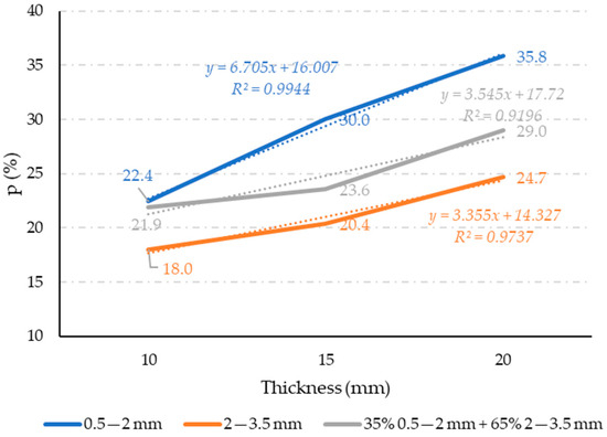 As visible out of Figure 8, with the increase in rubber grain size, porosity decreases in a nearly ideal linear relation. The decrease in porosity with the increase in rubber grain size may be attributed to higher specific surface area value of fine grain size (0.5–2 mm) compared to coarse grain size (2–3.5 mm) [32]. The smaller rubber grains have a larger specific surface area, and when the same amount of glue is used across all rubber fractions for panels of equal thickness, the coverage of the smaller grains with glue is less effective, leading to greater porosity. The fine rubber fraction produces the highest porosity, while the coarse fraction results in the lowest porosity. The porosity of mixtures containing both fine and coarse rubber falls between these extremes. These findings align with Figure 3, which illustrates a high proportion of small pores in panels made from fine rubber (Figure 3a), a lower proportion of larger pores in panels made from coarse rubber (Figure 3b), and a combination of both small and large pores in panels composed of mixed rubber fractions (Figure 3c). In a way, the fine rubber particles acted as an air bubbles in the polymer matrix. This phenomenon is evidenced by the more sensitive change in porosity with panel thickness increase for finer-grain-size rubber particles. Namely, the regression line for fine-grain-size rubber particles has a higher slope with the increase in panel thickness, which indicates a greater influence of panel thickness on such composites compared to a coarse rubber grain size.