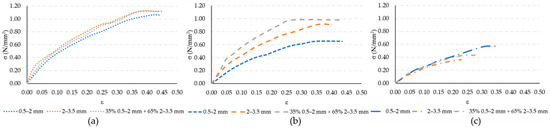 σ–ε diagrams of polymer composite samples: (a) 10 mm thick; (b) 15 mm thick; (c) 20 mm thick.