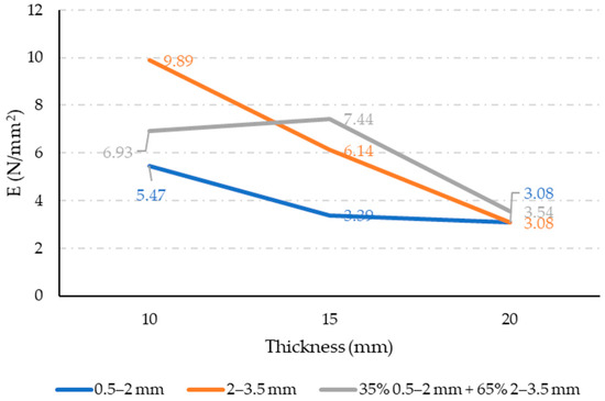 The σ–ε diagrams for the test specimens sawn out of each panel are shown in Figure 9, with the curve representing the average of three recorded measurements. The standard deviation was up to 20%. Based on the diagrams in Figure 9, the modulus of elasticity under tension was calculated within the deformation range of 0.05–0.25%, as specified by the standard “ISO 527-1:2019 Plastics—Determination of tensile properties—Part 1: General principles” [33]. The calculated modulus of elasticity results are shown in Figure 10. Presented results indicate high influence of both observed parameters: rubber grain size and panel thickness. The fine rubber particles resulted in high decrease in modulus of elasticity, indicating the higher deformability of such mixtures. This is in line with the result of increased porosity for such mixtures. On the other hand, for coarser grains, a significant influence of the panel thickness on the modulus of elasticity is observed. It indicates that for such a production method, the optimal panel thickness may be 15 mm. The combination of finer and coarser waste rubber grains exhibited the highest modulus of elasticity for a panel thickness of 15 mm, which is expected due to the effective interweaving of small and large granules, as seen in Figure 3c. Considering that the porosity results shown in Figure 8 do not suggest any reason for a reduced modulus of elasticity in the sample sawn out of a 10 mm thick panel made from a combination of fine and coarse rubber granules, the slightly lower obtained modulus of elasticity (6.93 N/mm2) in this sample can be attributed to a statistical error.