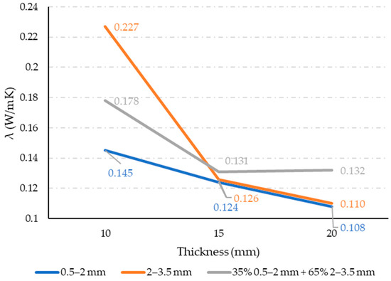 Generally, increasing panel thickness results in lower thermal conductivity, which presents a more effective insulation panel. The influence of panel thickness increase on the drop in thermal conductivity is less sensitive for fine-grain-size rubber particles compared to coarse grain mixtures.