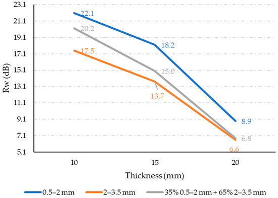 The measured airborne sound insulation index results are shown in Figure 12, with each value representing the mean of three measurements for each property. The standard deviations are up to 20%. Our measurements show that samples with a fine structure exhibit the best sound properties, while those with a coarse structure, characterized by larger particles, perform the worst. These findings align with theoretical assumptions about airborne sound transmission. For sound insulation coverings, it is crucial to prevent the formation of air cavities in the materials, as these cavities can facilitate sound propagation. Fine-structured materials have smaller pores and a more uniform distribution of granulate throughout the cross-section, unlike coarse-structured materials (Figure 3a,b). In coarse structures, the larger particles create shorter pathways for airborne sound to travel through, allowing for sound to pass through the material more easily. Also, the trends here are very similar to those of the porosities presented in Figure 8.