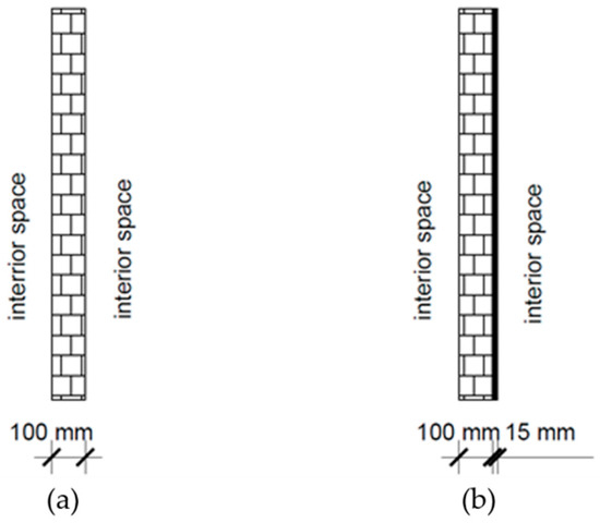 This section discusses the potential use of recycled rubber panels in civil engineering for the purpose of noise protection and enhancing a building’s energy efficiency. The effectiveness of these panels was analyzed by comparing an internal masonry wall (made of Porotherm units) without a waste rubber panel (Figure 13a) to one with a waste rubber panel (Figure 13b). The ability of the waste rubber panel to reduce noise and improve energy efficiency was evaluated. Given the relatively high modulus of elasticity, good sound insulation properties, and low thermal conductivity of the 15 mm thick panel made from a combination of fine and coarse rubber grains, this specific panel was selected for further calculations.