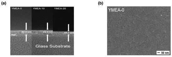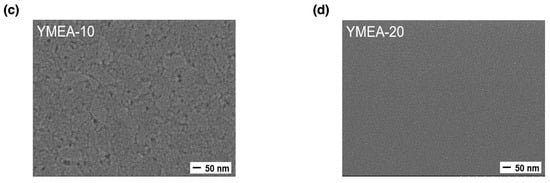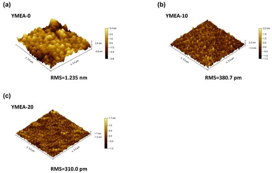 Figure 1a–d exhibit the FESEM images of the deposited films. The measured thicknesses of the YMEA-0 (Y2O3 only), -10, and -20 films were 49.6, 49.5, and 33.7 nm, respectively. The thicknesses of the films decreased up to YMEA-10. In addition, the YMEA-0 and YMEA-10 films contained wrinkles on their surfaces. However, these wrinkles disappeared and the surfaces became smooth (YMEA-20). The wrinkles originated from the relaxation of stress in the deposited films. Owing to the different thermal expansions between Y2O3 and ITO and the decrease in the capillary force of the liquid phase, compressive stress was generated, thereby forming wrinkles on these surfaces []. As compressive stress decreased, film thickness decreased; therefore, YMEA-20 contained a flat and smooth surface. In addition, the added MEA stabilized particle growth and suppressed particle agglomeration, yielding even distributions and generating even and uniform surfaces []. The SPM surface images of the films are presented in Figure 2 and the measured root-mean-square surface roughness (Rp) for films was 1.235 nm, 380.7 pm, and 310.0 pm, respectively. The smoothness of the film surfaces increases as the MEA ratio increases.